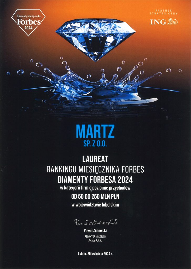 We are very pleased to announce that this year as many as 3 of our companies, i.e. TEMARED, martz and UNITRAILER, have been honoured with the ‘Forbes Diamonds 2024’ award in the category of companies with a revenue level between PLN 50 and 250 million in the Lubelskie Voivodeship.