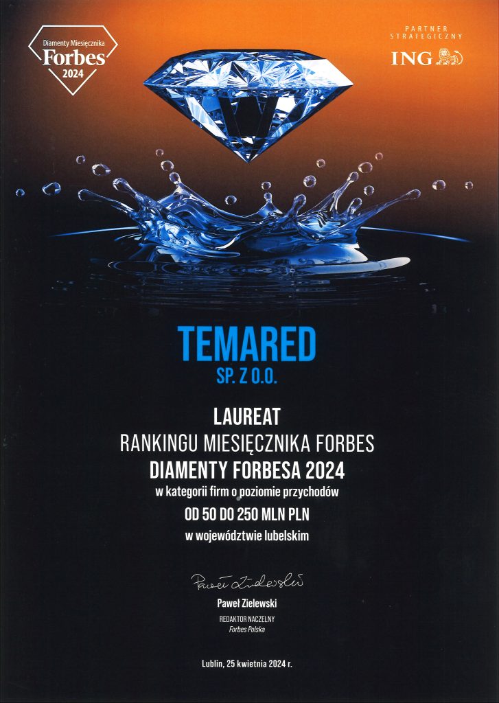 Nous sommes très heureux d’annoncer que cette année, trois de nos sociétés, TEMARED, martz et UNITRAILER, ont reçu le prix « Forbes Diamonds 2024 » dans la catégorie des sociétés dont les revenus sont compris entre 50 et 250 millions de PLN dans la voïvodie de Lublin.